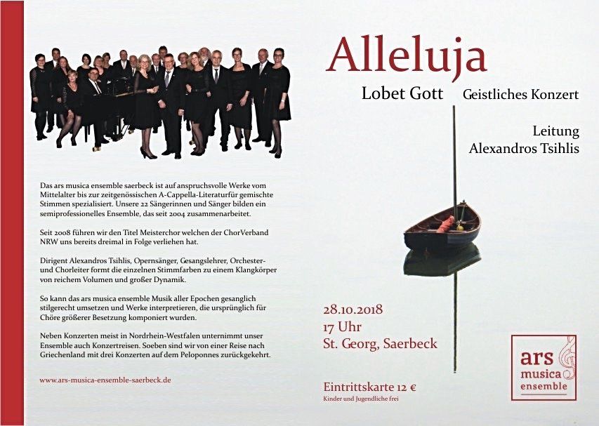 Der zweite Chor, das „ars musica ensemble“, stammt aus Saerbeck und wird ebenfalls von Alexandros Tsihlis geleitet. Die klangliche Ausrichtung und die stilistische Lied-Auswahl wurden vom Vorgänger-Chor fortgeführt. Es war mit der Tsihlis-Eigenkomposition „Se Hymnoumen“ sogar dem „Tebe Poem“ eine musikalische Entsprechung gegenübergestellt, nur die Sprachen des „Lobet den Herrn“ variierten. Eine Entsprechung auch beim „Abendlied“ von Josef Rheinberger, die mit dem „Abendfrieden“ des vorangegangenen Männerchors korrespondierte.